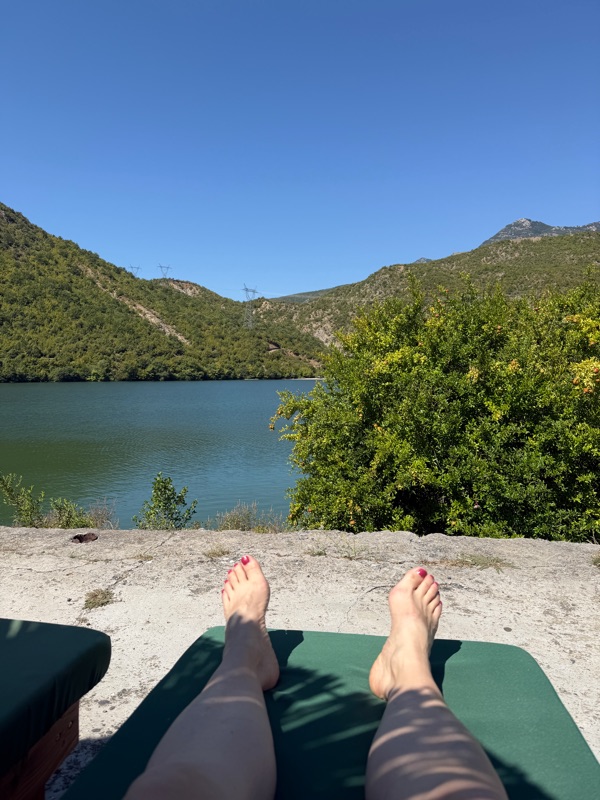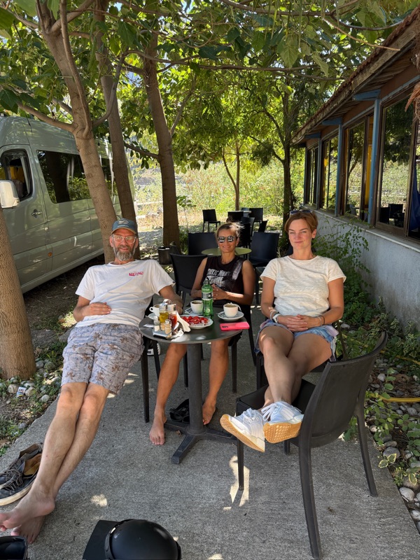 Dort lässt es sich für Thom und mich im Schatten am Drin Ufer aushalten, während die anderen Frühstücken gehen. Ausser ein paar Salzstangen und ein bisschen trockenen Reis den die anderen vom Vorabend mitgebracht haben, können wir uns kein Essen vorstellen. Das Agriturizmo hat eine Waschmaschine und da Pausentage ja Waschtage sind, können wir hier heute unsere Klamotten wieder frisch machen. Ein Traum!