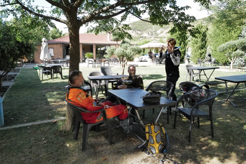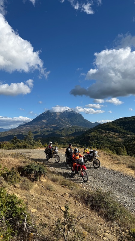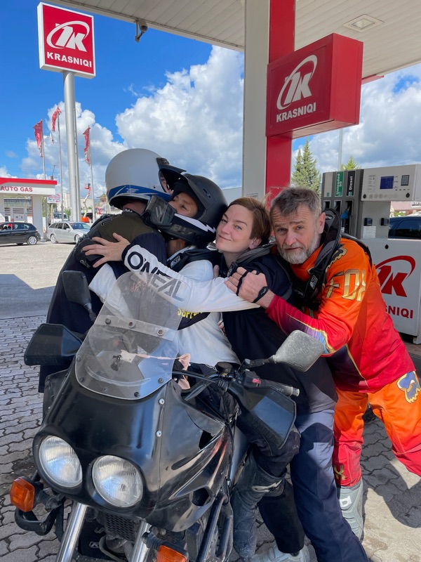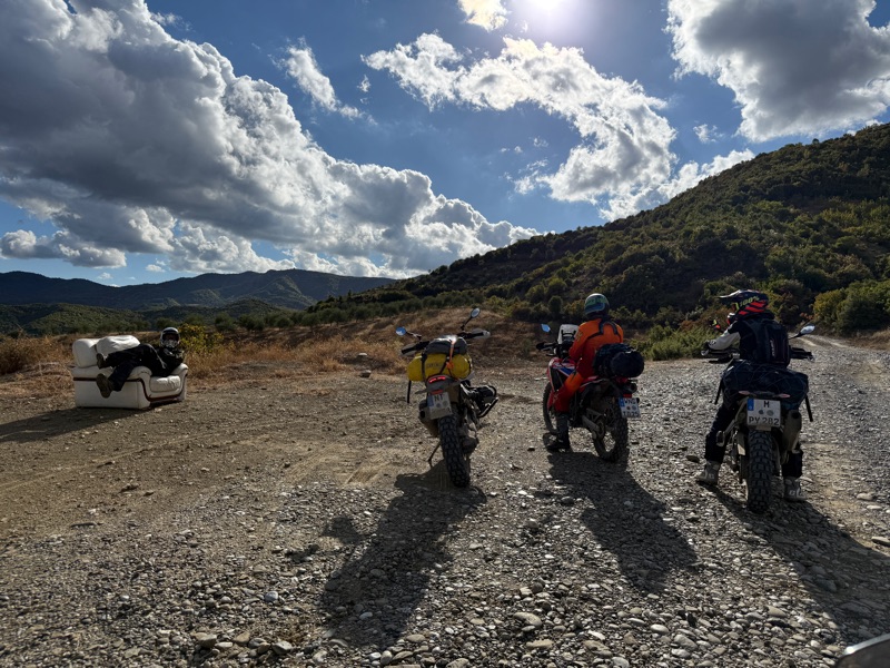 Während wir noch da sitzen finde ich auf Facebook in der TET Gruppe einen Post einer Niederländerin die in Albanien Richtung Griechenland unterwegs ist und einen neuen Reifen sucht, auf dem Bild erkenne ich das Motorrad, das gestern an uns vorbeifuhr, während wir Thoms Motorrad wieder gefixt haben nach der Ölspur. Ich schreibe ihr, dass wir uns wohl gestern gesehen haben und nach kurzem Hin-und Herschreiben sind wir uns einig dass wir uns gesehen haben.