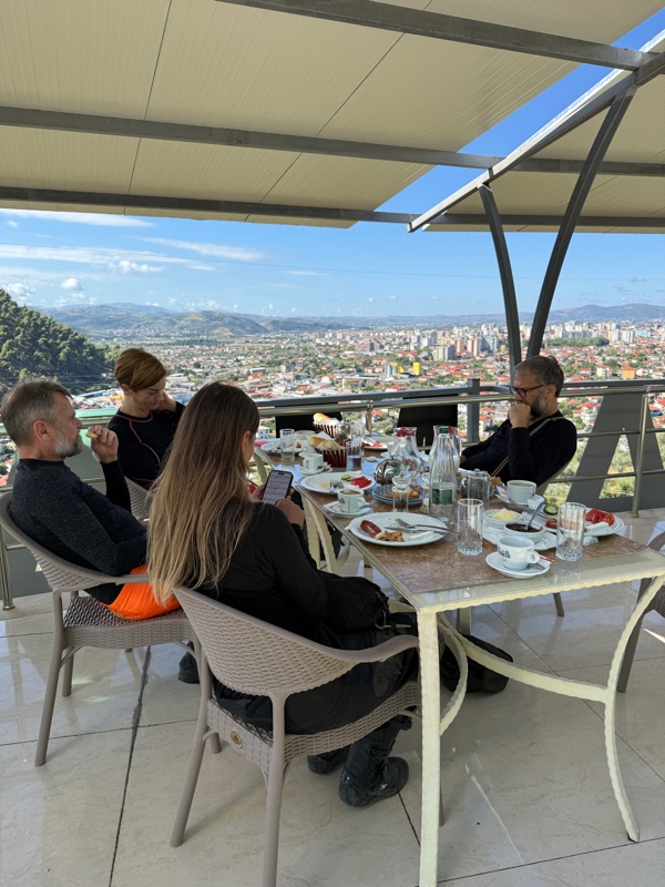 Wir haben uns für 9h zum Frühstück verabredet. Der Capucchino ist ungenießbar, irgend so ein gesüßtes Pulver mit Wasser aufgegossen. Die Mädels lassen ihn zurückgehen und sagen das sei ja kein Kaffee, daraufhin meint der Kellner er könne auch echten Kaffee bringen. Cool, her damit, und der ist voll okay. Und das Frühstück mit hübscher Aussicht.