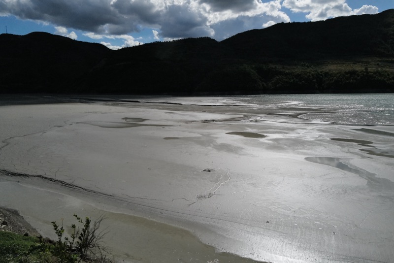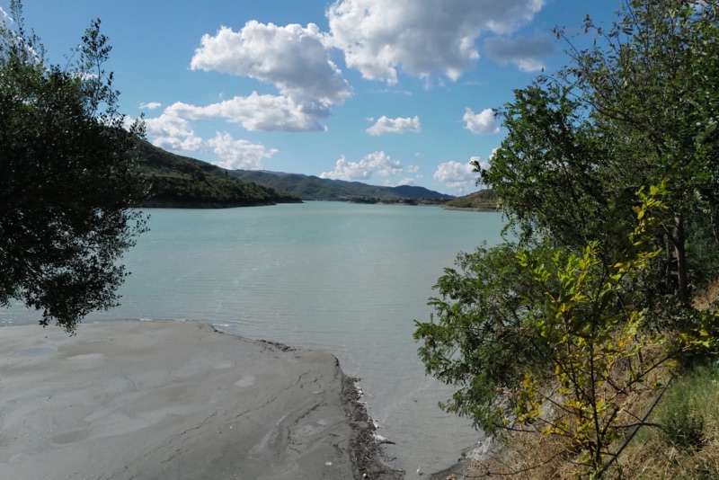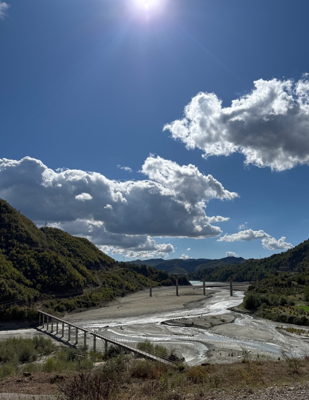 Wir sind jetzt aber ziemlich durchgepowert und brauchen ne Pause. An der Strasse kommt ein Restaurant, hier ist Cola Pause. Trotz des späten Starts in den Tag kommen wir insgesamt ganz gut vorwärts. Nach einer Landschaft die aus Sandhügeln besteht, kommen wir runter an den Fluss Lumi Devoll der türkis in der Landschaft glänzt.