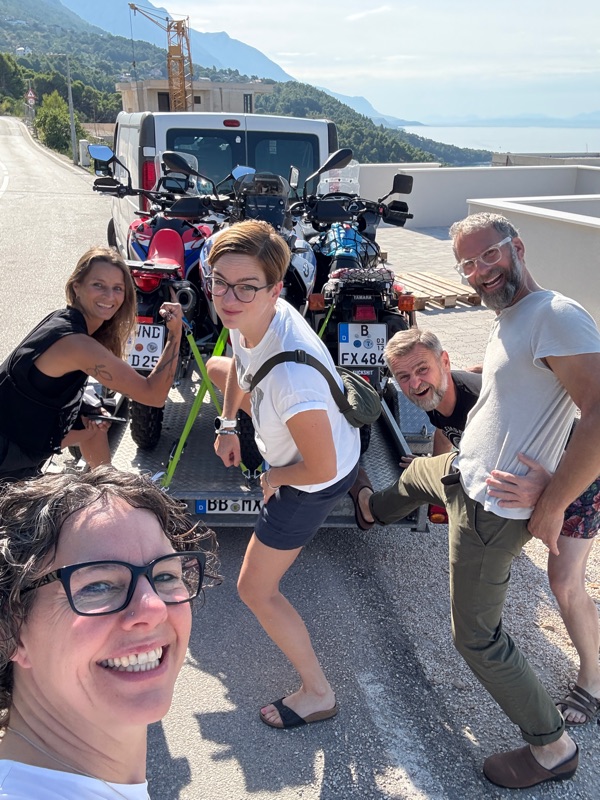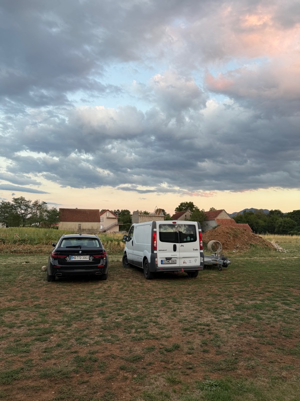 Dann war es höchste Zeit den PKW, Bus und Hänger endlich zum Onkel meiner Kollegin zu bringen, bei dem wir alles für die nächsten 3,5 Wochen stehen lassen können. Nachdem ich Kollegin Jasna geschrieben habe, dass wir in 30 min da sind kam ein verdutztes Heute? Ich hab Montag mit Euch gerechnet!
