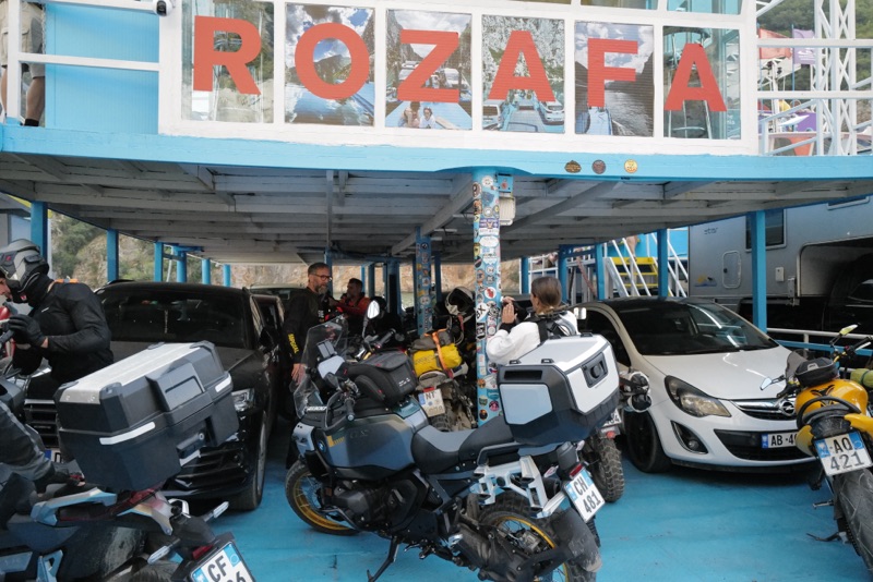 Das Abendessen hat mir noch nicht so gut bekommen mir geht es heute noch nicht gut. Uller hat gestern unsere Fährtickets besorgt und der Plan ist zu Frühstücken und dann um 8:15h an den Mopeds zu sein um zur Fähre zu starten. Nach dem schlechtesten Cappucchino Albaniens - ausgerechnet bei einer Italienerin, schaffen wir das auch ganz gut und fahren zur Strasse, ab da werden wir alle 10 Meter gefragt, ob wir ein Ticket haben und es reicht, dass wir ja sagen, dann dürfen wir weiter bis durch einen Tunnel der direkt im Fährhafen endet (der wirklich winzig ist). Weil alle Autos rückwärts auf die Fähre müssen, ist es automatisch schon ein Schlamassel, weil kaum Platz zum wenden ist. Zusätzlich laufen zusätzlich noch ein Haufen Backpacker rum, dazwischen Radfahrer, Motorradfahrer… es fehlen eigentlich nur noch Tiere. Ah und natürlich gibt es auch noch eienen Obstverkäufer der vollreife Ware im Angebot hat.
