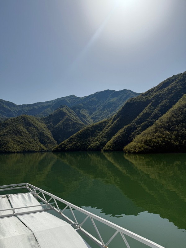 Bevor wir drauf dürfen, müssen wir aber nochmal irgendeine Steuer zahlen. Aber dann dürfen wir tatsächlich auf die Fähre. Wir sind genau rechtzeitig gekommen und schauen dem Spektakel dann noch zu, bevor die Fähre fast pünktlich um viertel nach 9 ablegt. Ca 2,5h dauert die Fahrt über diesen Stausee mit seinen vielen Seitenarmen und durch die Felsen was schon Fjord-ähnlich wirkt. Einzig die Plastikflaschen die herumschwimmen stören die Romantik.