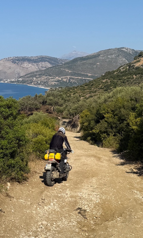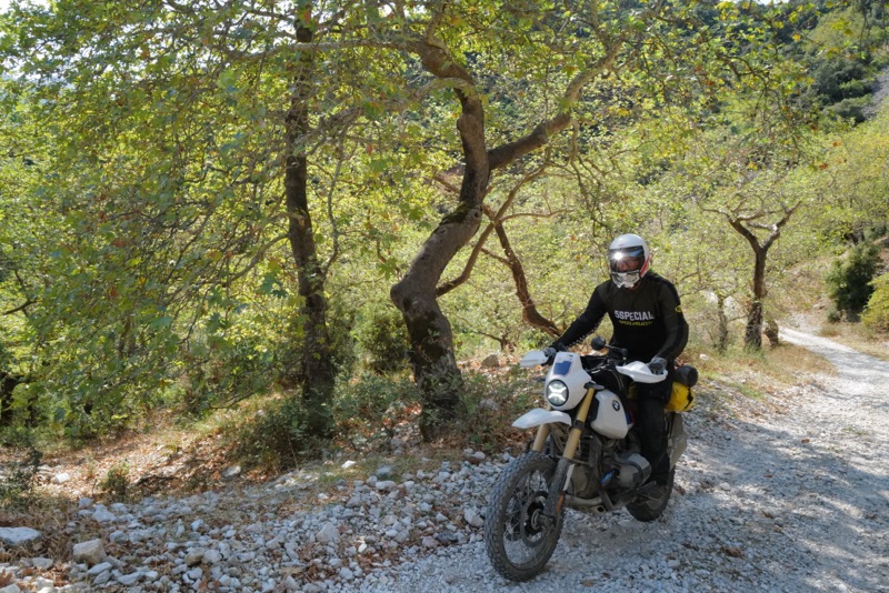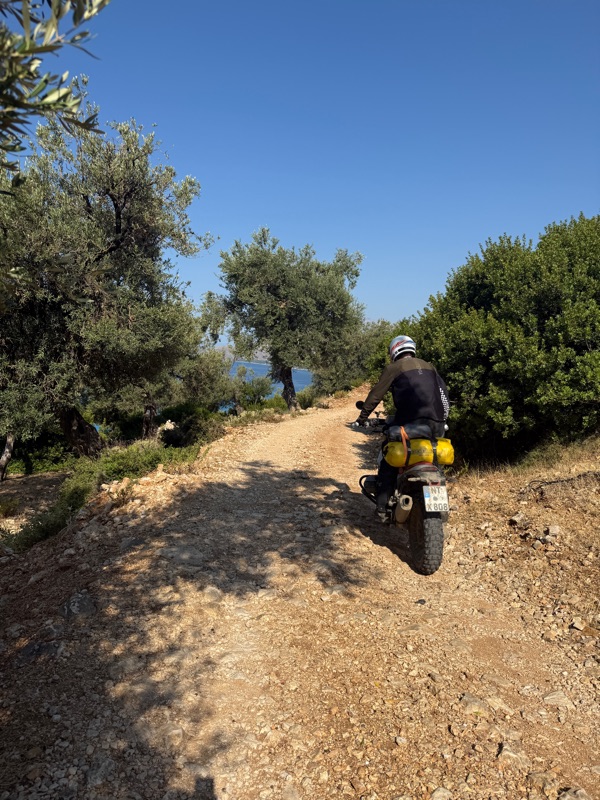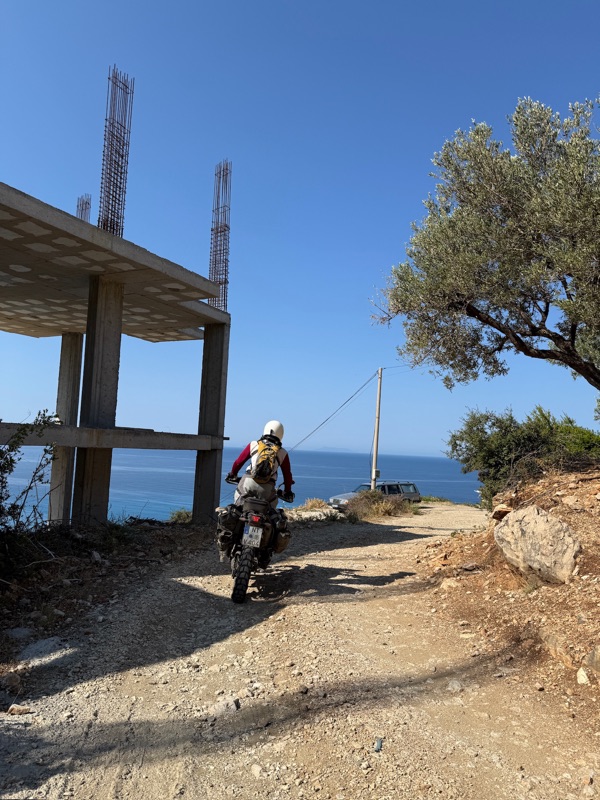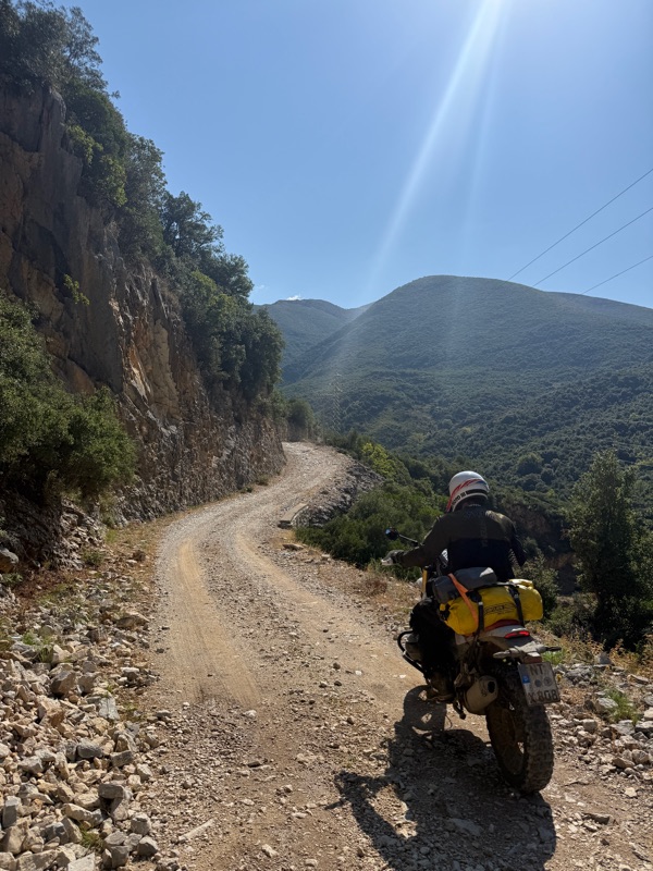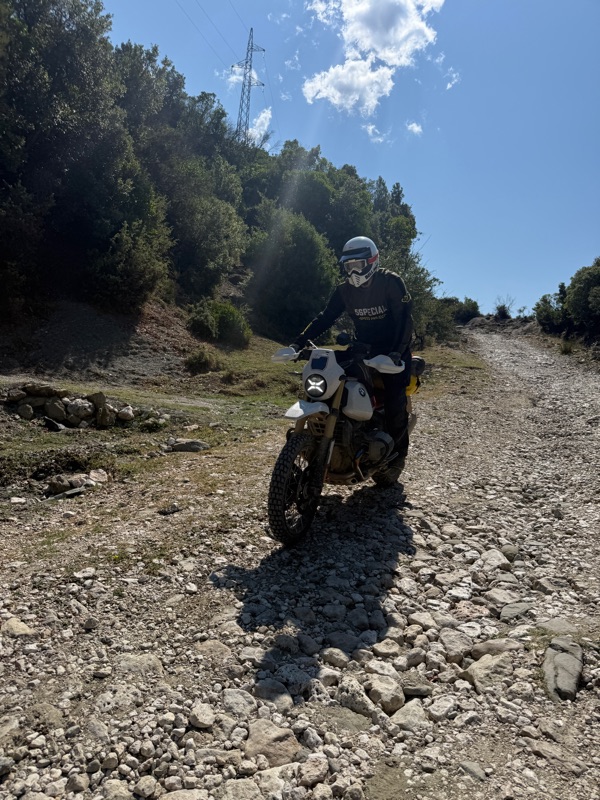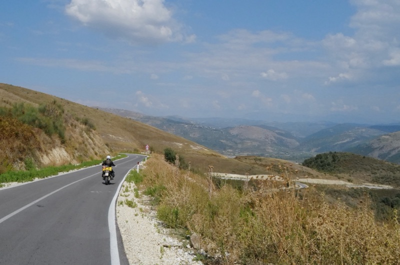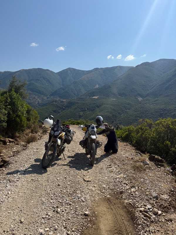 Wir selbst fahren danach direkt wieder vom TET weg auf eine kleine Kurvenstrasse die sehr hübsch ist und Richtung Flier geht. Einziges Problem- der Strassenbelag. Wenn mal nicht etwas AUF dem Belag das Problem ist und rutscht dann der Strassenbelag selbst. Der ist in einer Kurve so gnadenlos rutschig dass Uller ganz Thom Style einfach einen Seitruscher macht. Da es bergauf geht rutscht er nur ein paar Zentimeter. Also Strassenfahrer kommen in Albanien eher nicht auf ihre Kosten. Die Straßen hier lassen sich nicht ausreizen…
