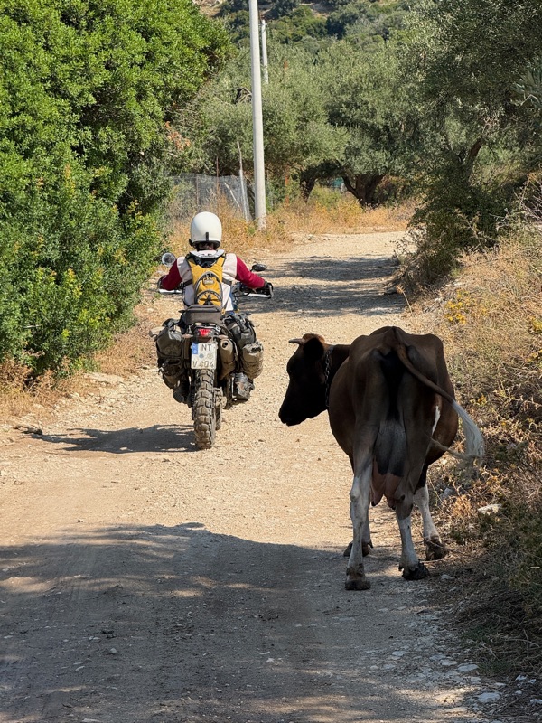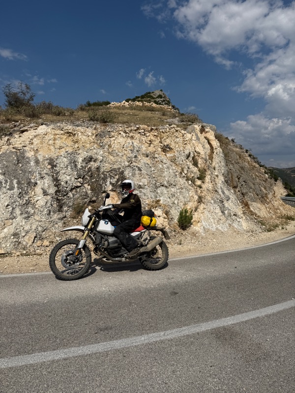 Nochmal ein kurzes Stück Strasse dann geht es hoch in die Berge. Mit grobem Schotter, Tiefblick und allem was direkt warm macht obwohl es eh schon heiß ist. Entsprechend findet es die BMW auch zu heiß und zeigt Uller eine Warnung an, sie beruhigt sich aber gleich wieder. Zum Glück.