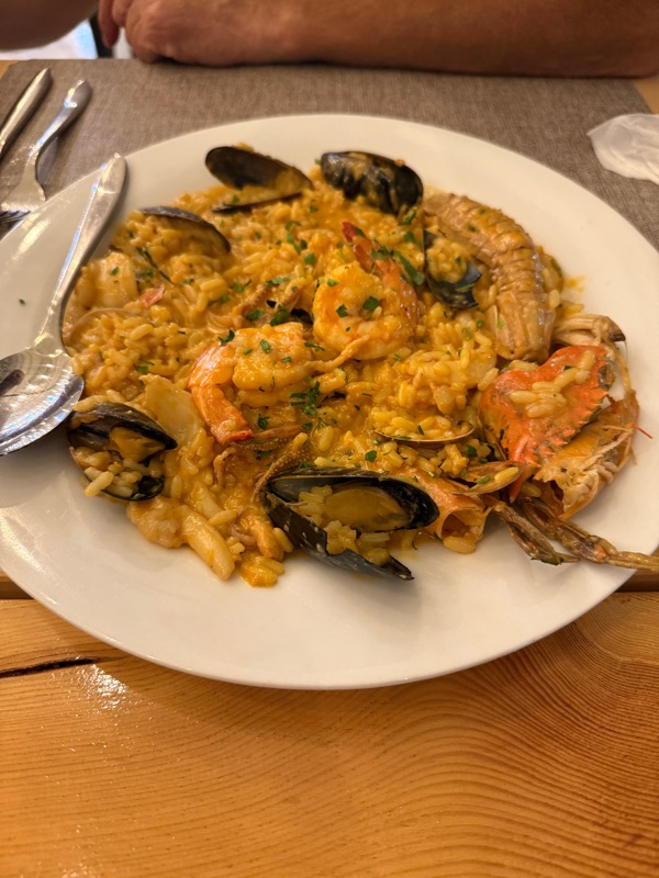 Nach einer Stunde auf der Schnellstraße erreichen wir Durrës, ein ziemlicher Moloch mit Bettenburgen. Aber wir finden ein Hotel mit Meerblick für eine Nacht und essen nach dem kitschigen Sonnenuntergang und einer wohltuenden Dusche gewohnt lecker ein Meeresfrüchte Risotto.