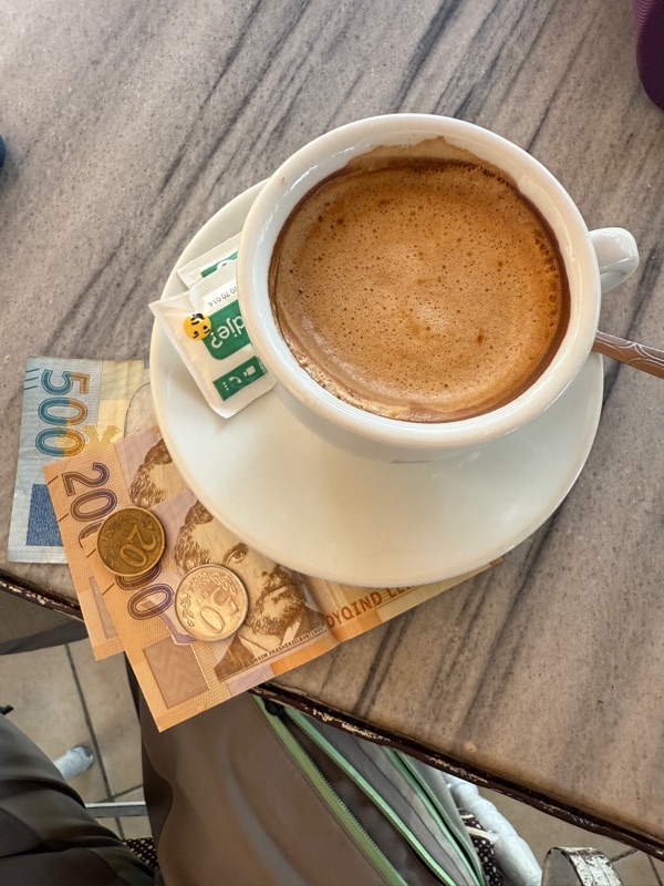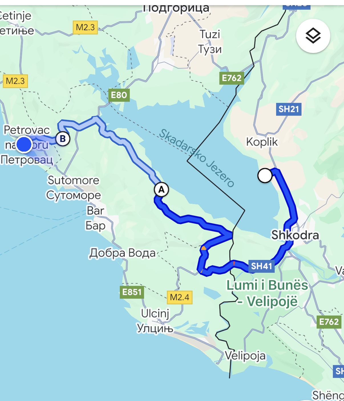 Dann bietet sich auch noch eine Nacht am Meer an und es gibt zwei entspannte Halbtagesfahrten. Also gut! Erstmal Frühstück und mich in Schatten packen. Dann ist das Ziel erst Tanken, Lavazh (Autowäsche) und alle restlichen Lekë loszuwerden. Erstmal stauen wir uns durch Shkodra durch (der Algorithmus von Kurviger fand das wohl besser als die bequeme Ungehungsstrasse 🙈. Dann kommen wir schon zügig Richtung Grenze und haben immer noch alle Lekë! Aber dann kommt die rettende Tankstelle. Leider aber keine Lavazh. Dafür ein Café und ein Souvenirshop um noch Getränke und Pistazien für das Restgeld zu kaufen.