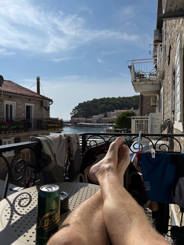 Wir haben gestern Abend noch sinniert wann und wie wir nach Niksic zurückkommen wollen einerseits haben wir keine Lust mehr auf die Klamotten und die Hitze andererseits ist der Urlaub zuende sobald wir in Niksic sind. Die Übernachtungen mit dem Gespann aus Bus und Hänger mit 4 Mopeds werden diesmal (aus Gründen) vom Pragmatismus geprägt sein. Also Hauptsache ebenes und weitläufiges Parken also keine kroatischen Dörfer am Meer 😂